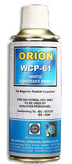 | ORION WCP - 61 | White Contrast Paint used with ORION visible Magnetic Particlesfor WET method inspection in aerosol containers. | Conforms to BS 5044 | 280 / 400 ML aerosol containers |